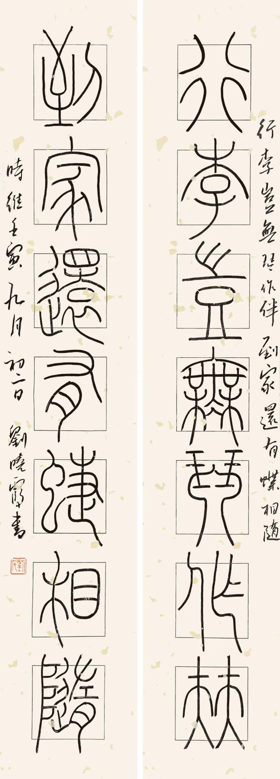 刘晓霞 篆书对联 行李岂无琴作伴 到家还有蝶相随