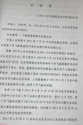北京市公证处对沈丽洲送入太空作品出具的公证书